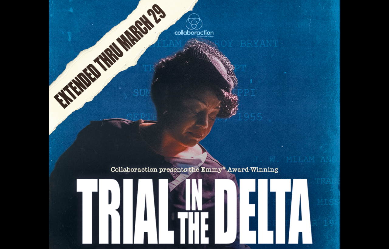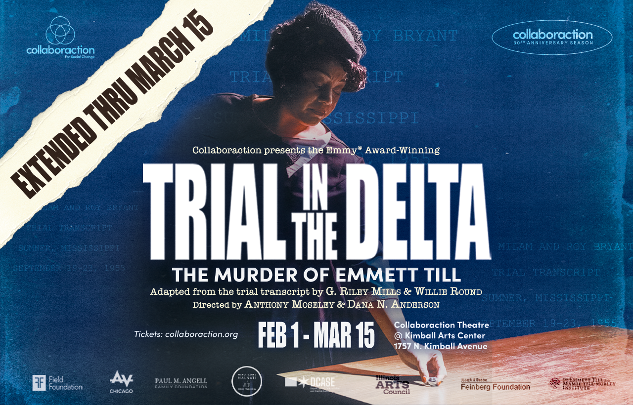 On September 20, 1955, testimony began in the murder trial of two members of Emmett Till’s lynch mob. What happened in that trial, in the weeks leading up to it and the months after would change America. Collaboraction’s original live staging of Trial in the Delta, book by Willie Round and G. Riley Mills, directed by Anthony Moseley and Dana Anderson, is drawn directly from the recently unearthed trial transcript of “The State of Mississippi vs. Roy Bryant and J.W. Milam.” The production plays like a live reenactment of the actual court proceedings in Sumner, Mississippi in 1955, with top Chicago actors, seated among the audience, taking the stand as witnesses for the defense and prosecution, including Emmett Till’s history-making mother, Mamie Till-Bradley.